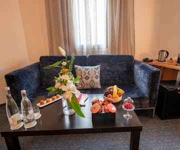 39 m². Queen size bed. Lounge area with sofa, desk area, dressing room, wireless internet access and direct dial telephone, satellite TV with thematic channels in several languages, mini-bar, air conditioning, safe, bathroom with Italian shower, toiletries. Courtesy tray with tea and coffee.